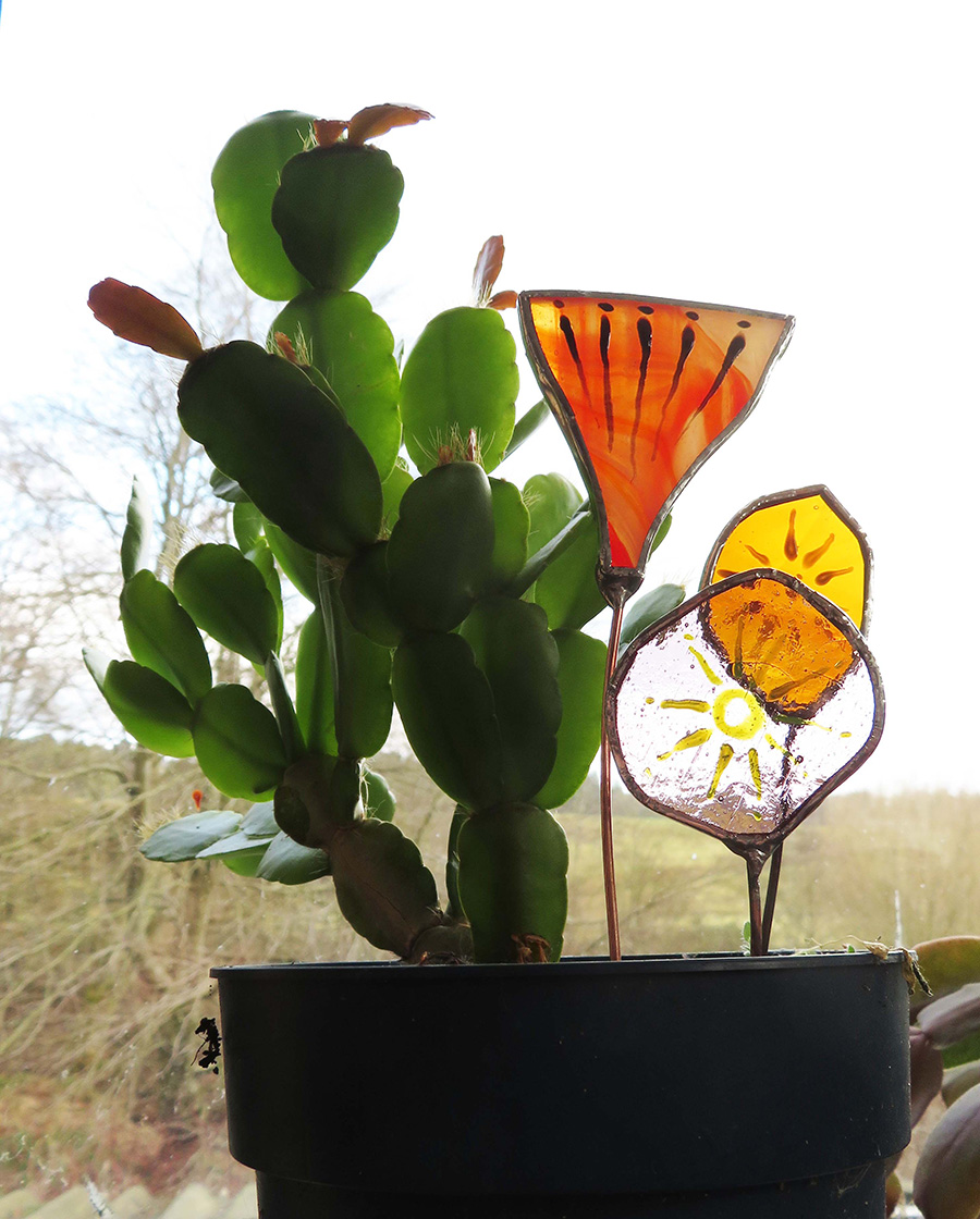 Participants will learn to cut glass, apply copper foil and solder to make glass flower decorations.